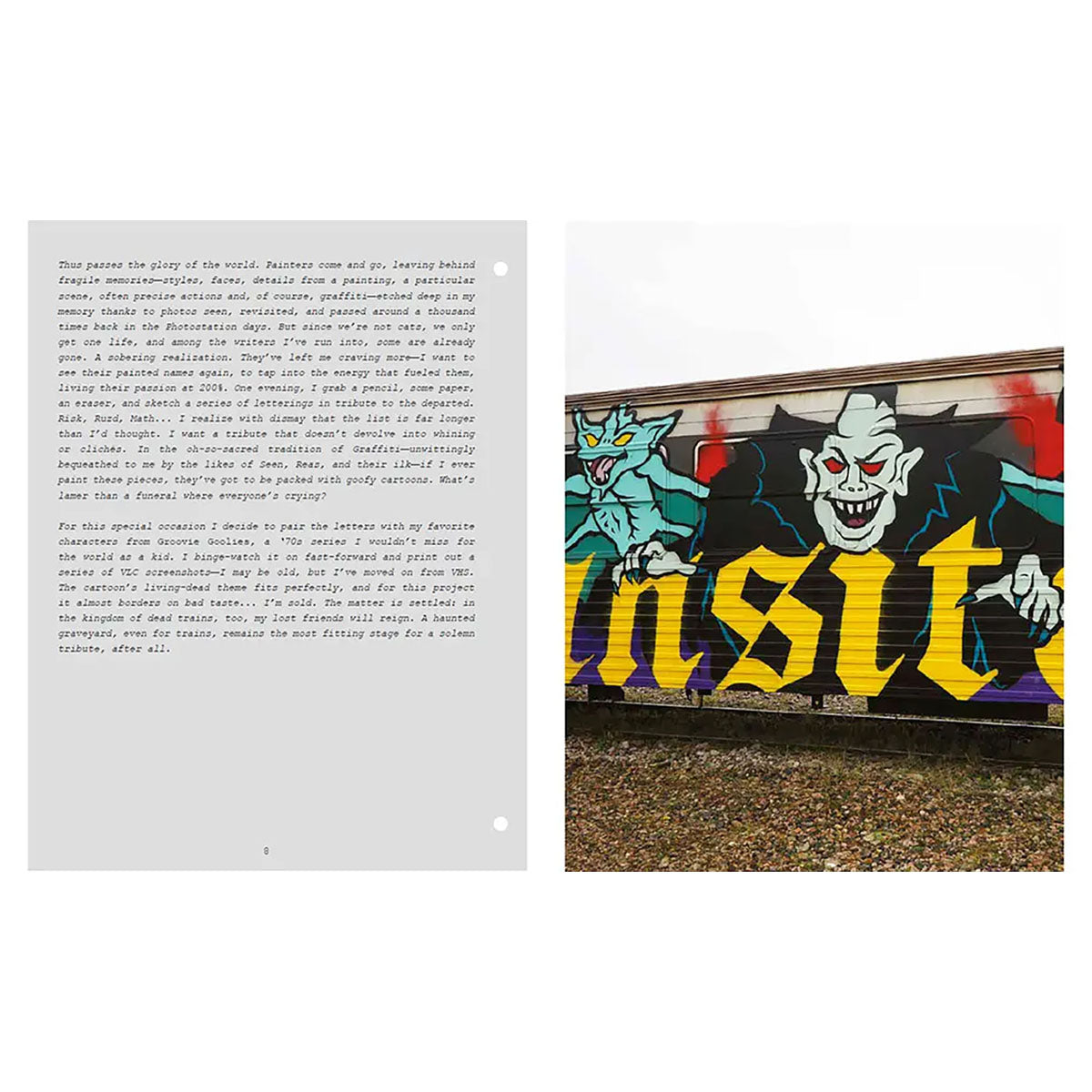Each chapter focuses on one writer, mixing archival train photos with OPAK's memories of painting together. He went back to discarded trains in French trainyards to paint memorial pieces for each of them, turning these train graveyards into sites of remembrance. The book asks an important question - how do we preserve the memory of writers who left the game too early?